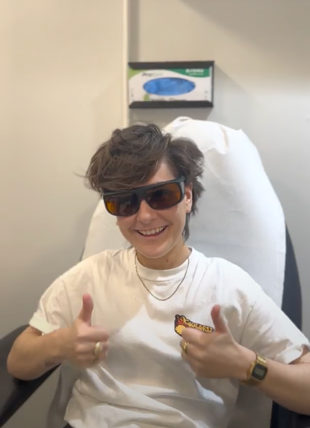 Then the consultant takes me to my treatment room. It’s a cosy space, with tattoo artwork up on the walls and a relaxing chair for me to sit in. I get ready and take my shoes off, and the consultant walks me through some medical forms, answers any questions I have and lets me know that they’ll use a cooling system machine alongside the laser to help with any discomfort. The machine blasts -30C air (ice, ice baby) that feels really nice alongside the laser (don’t worry - it doesn’t interfere with the laser’s energy).