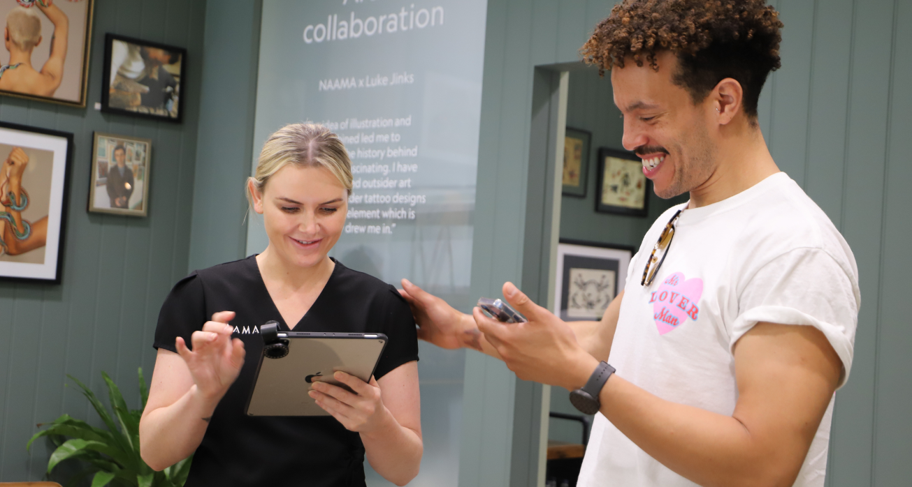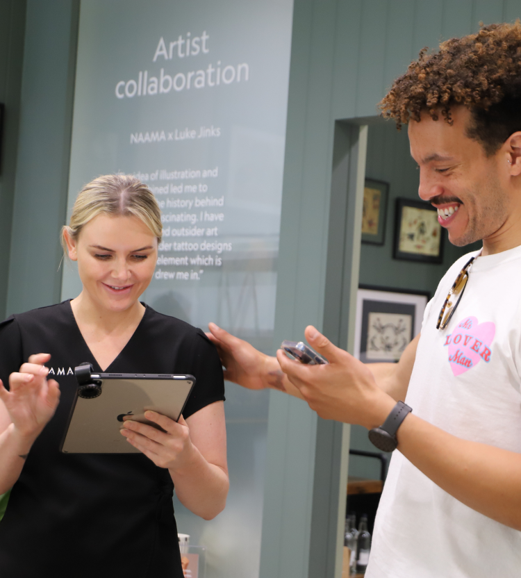 Next up is applying aftercare cream. Our NAAMA aftercare range is the perfect addition to any tattoo clearing journey with two naturally formulated creams designed with your body in mind. It pairs perfectly with a high SPF, which you’ll also need post treatment.